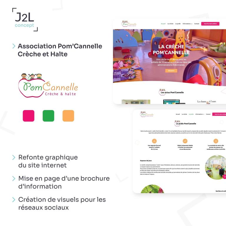 « La société J2L CONCEPT a réalisé le site internet de l'association POM'CANNELLE gestionnaire de 2 crèche-multi-accueil ainsi qu'un kit de communication associé. Nous avons été très satisfait de l'écoute (et de la patience) de Laura pour la création d'un site sur mesure proposant un environnement graphique et visuel en phase avec notre activité. Et grâce à la conception technique de Jonathan ce site est devenu l'interface dont nous avions besoin pour collecter les demandes d'inscriptions. Nous sommes très satisfait de leur professionnalisme et de la qualité des contenus livrés. »