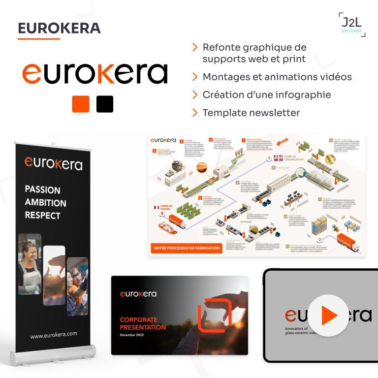 Dans le cadre de la refonte totale de son identité de marque, nous avons réalisé pour EuroKera de nombreux projets graphiques et audiovisuels, pour la communication interne et externe :
