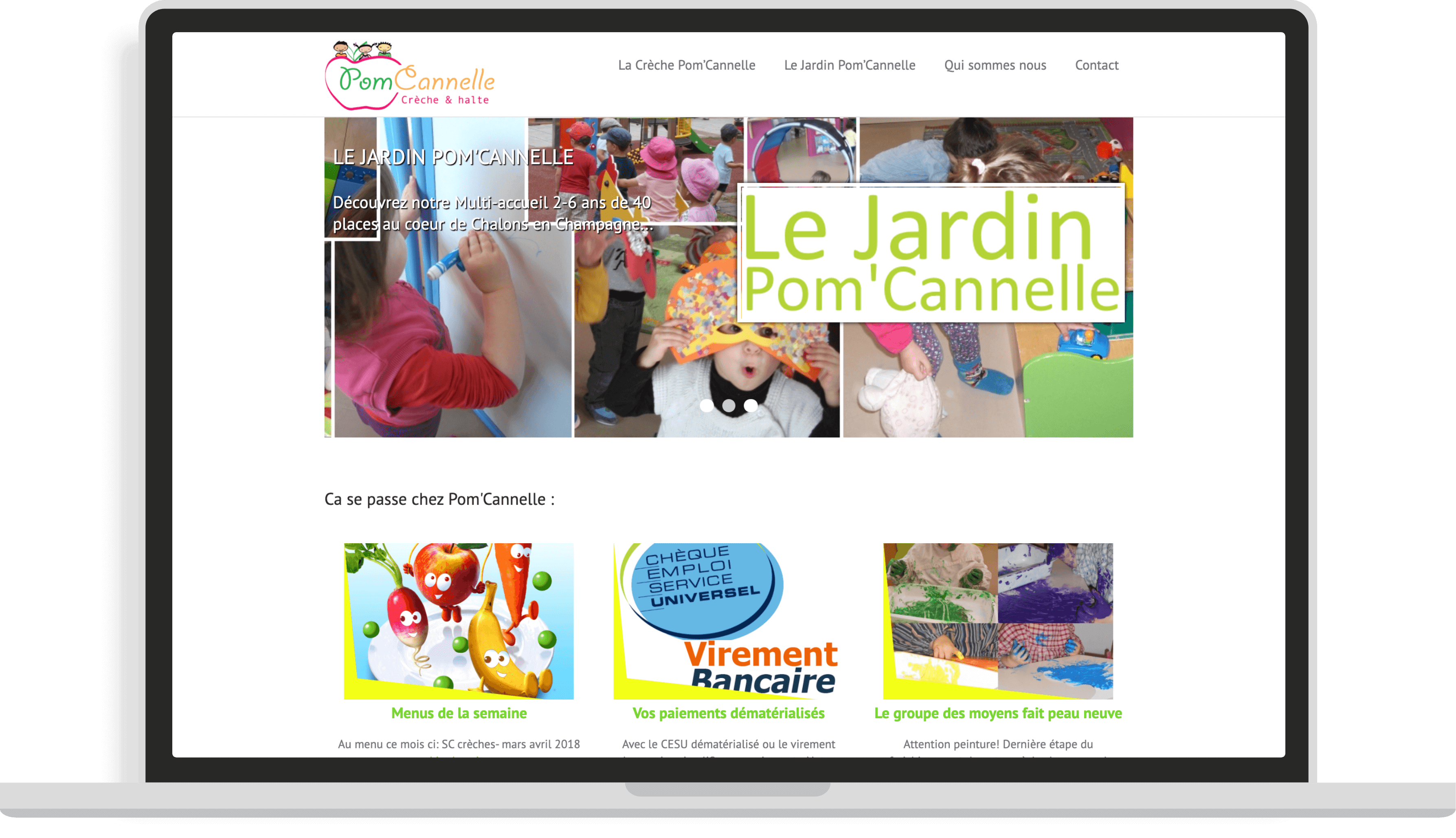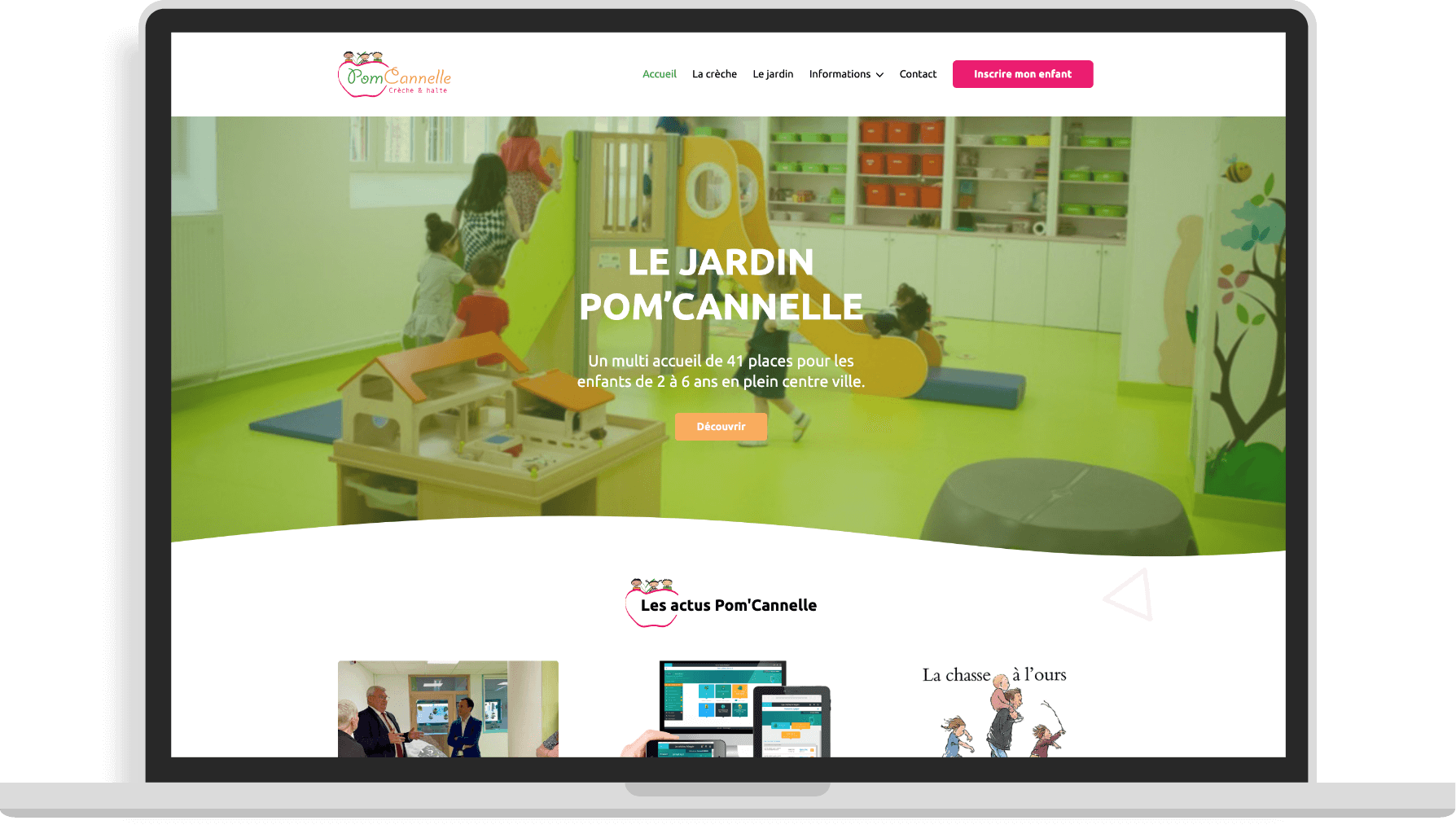 En partant des couleurs de base du logo, nous avons proposé cette refonte avec une composition aérée, ponctuée de formes douces afin de présenter au mieux la crèche, ses infrastructures et son environnement.