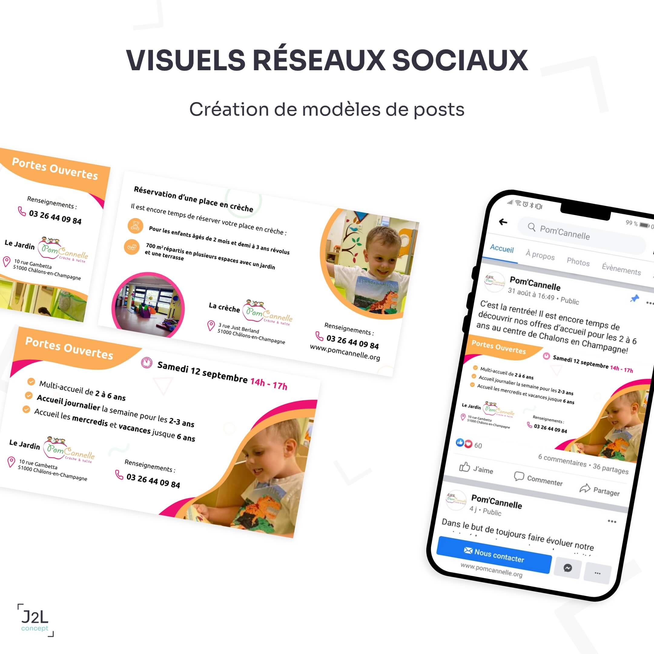 Afin de dynamiser l’image de Pom’Cannelle sur les réseaux sociaux, des modèles de posts ont été réalisés pour mettre en avant certains évènements comme les portes ouvertes ou encore pour promouvoir la réservation de place en crèche dans des posts sponsorisés.